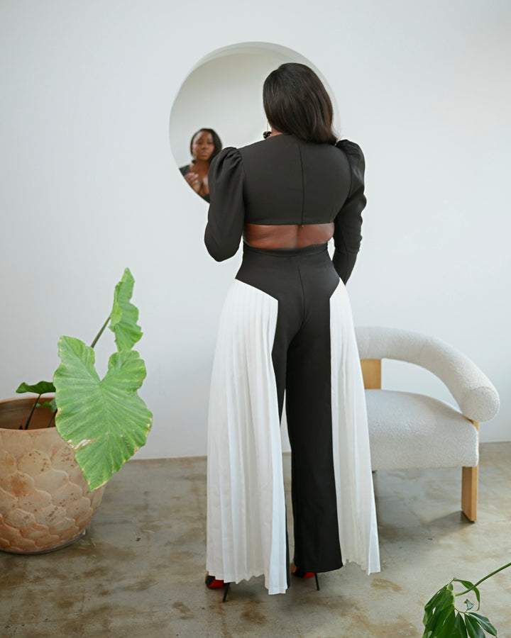 Elevate your wardrobe with the LOOK 1180 2 Tone Jumpsuit, featuring fashion-forward puff shoulders and elegant pleated side panels that add dynamic texture. The waist cutouts highlight your silhouette with a modern edge, while the back zipper ensures a sleek fit. For the perfect shape and comfort, we recommend sizing up. Make a statement effortlessly in this striking, stylish jumpsuit.