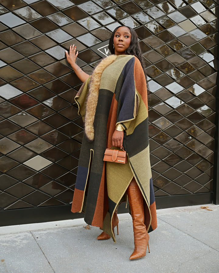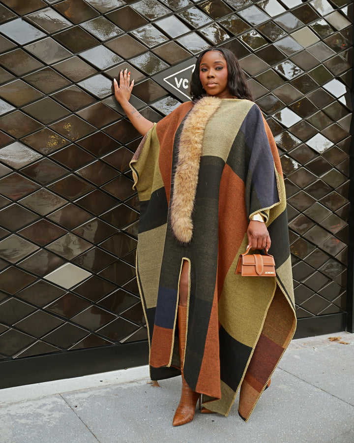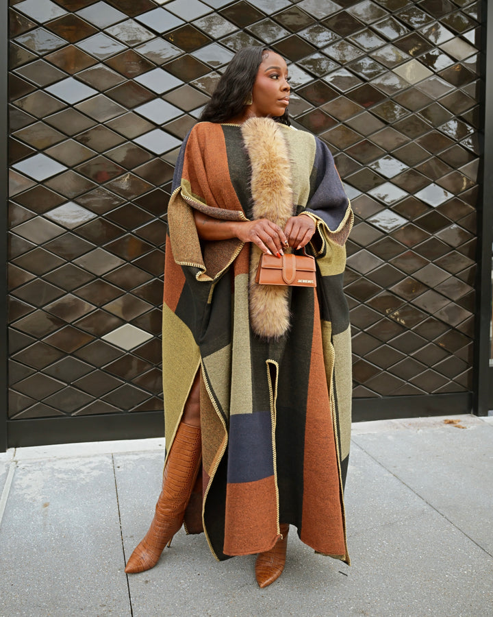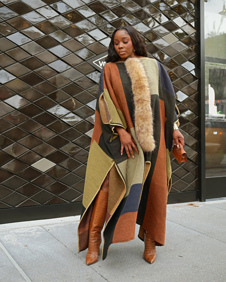 Elevate your winter wardrobe with this stunning long poncho, a versatile layering piece that effortlessly transitions from casual to sophisticated. Luxurious faux fur details add texture and glamour, creating an eye-catching focal point that commands attention. The generous silhouette provides comfortable coverage while the flowing design flatters every body type. Perfect for draping over your favorite outfits, this poncho delivers instant polish and warmth without sacrificing style.