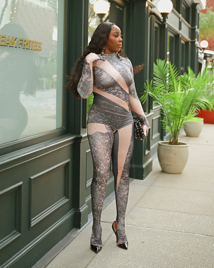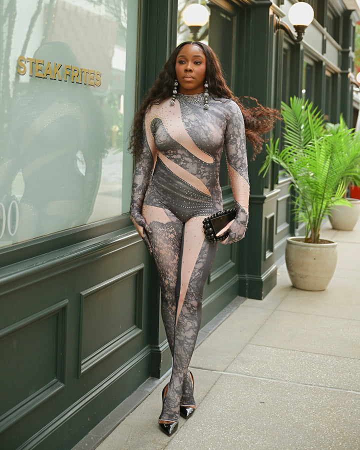 Elevate your wardrobe with this stunning lace illusion jumpsuit that combines sophistication with comfort. Featuring a chic mock neck and strategically placed back zippers for an edgy twist, this piece delivers modern style with effortless elegance. The super-stretchy fabric moves with you, ensuring all-day comfort without compromising on that fabulous, polished look. Perfect for making a statement at any occasion.