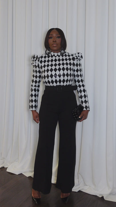 Command the room in this Sequin Power Jumpsuit, a bold statement piece designed for women who lead, not follow. Featuring an eye-catching diamond sequin pattern and exaggerated puffy shoulders, this jumpsuit delivers high-impact glamour with a confident, sculpted silhouette.